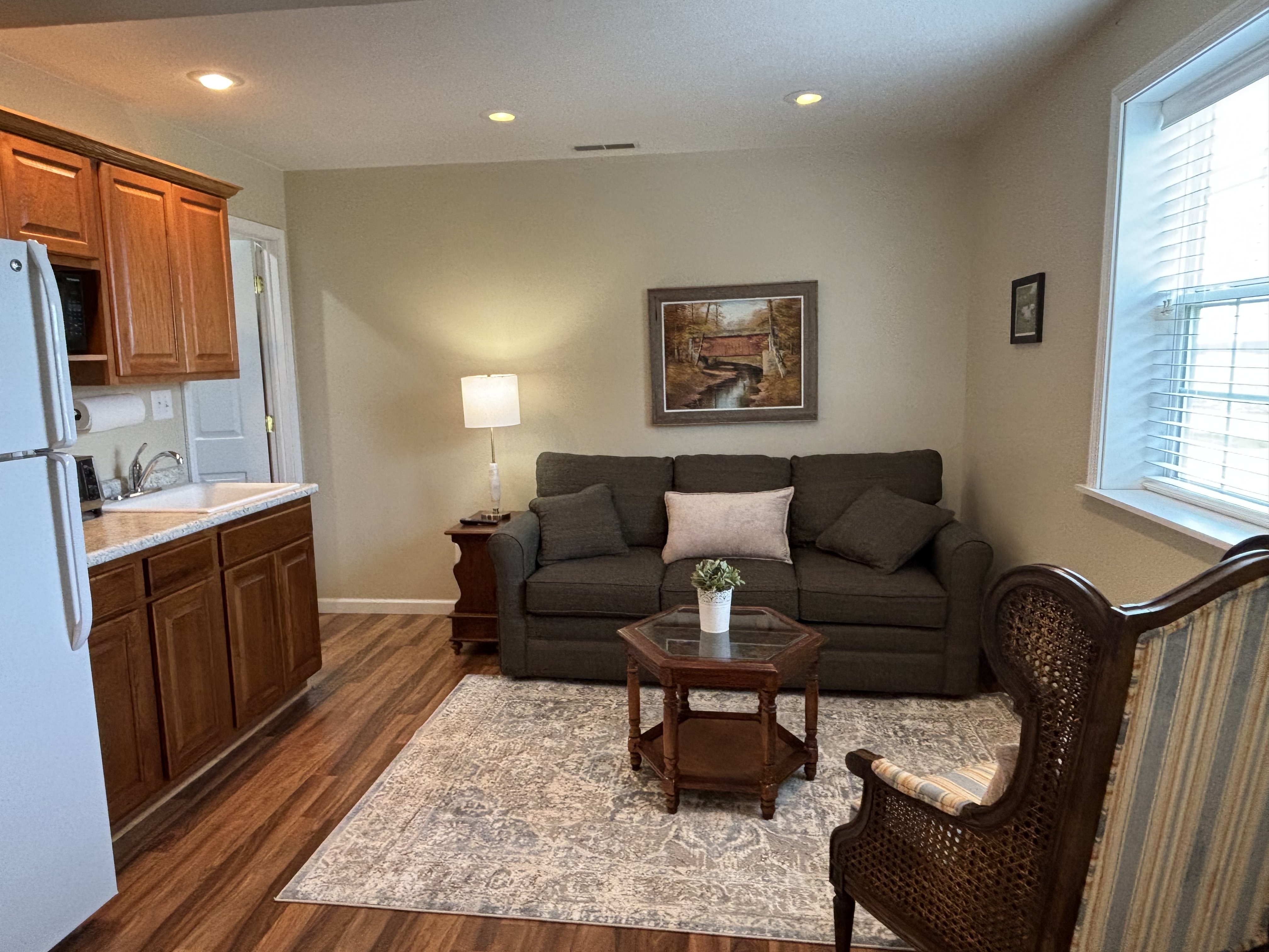 Tucked beside Granny’s Farmhouse in a beautifully finished barn, this king suite offers the perfect blend of rustic charm and modern comfort. The spacious bedroom features a king bed and comfortable chair. A full bath, efficiency kitchen, and living area with queen sofa-bed make it ideal for couples or overflow guests. Book it as your own private retreat or add it alongside Granny’s Farmhouse when the group needs more space. Minutes from Turkey Run State Park and the Covered Bridge Festival.